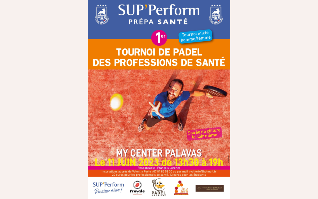 SUP’Perform organise le 11 juin prochain au My Center Palavas le 1er Tournoi de Padel des professions de santé (P250) de Montpellier en partenariat avec l’association sportive de l’Institut de Formation en Masso-Kinésithérapie (IFMK) de Montpellier.
