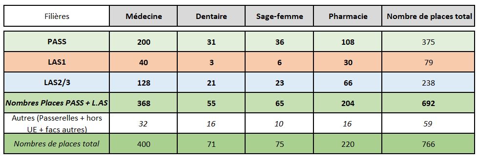 Nous avons fait le choix de différencier le nombre de places total du nombre de places pour PASS et L.AS. En effet, en plus des places disponibles pour PASS et L.AS vient s’ajouter un nombre de places disponibles pour :