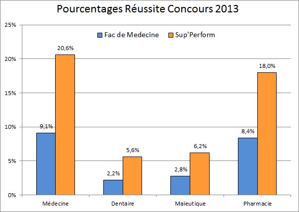 Au total 32,5% des étudiants de la faculté ayant réussi un concours étaient inscrits à Sup’Perform alors que seulement 14,5% des étudiants de la fac suivaient notre préparation.